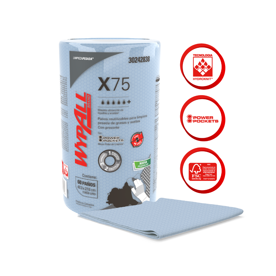 Wypall* X75 Plus Power Pockets rollo Máxima absorcion de aceites y poder de limpieza Ideales para: limpieza en tareas con gran cantidad de aceites, grasas y agua, superficies dificiles, con su tecnologia power pockets ofrece un 30% de mayor poder de limpieza en la remocion de particulas, aceites y grasas.